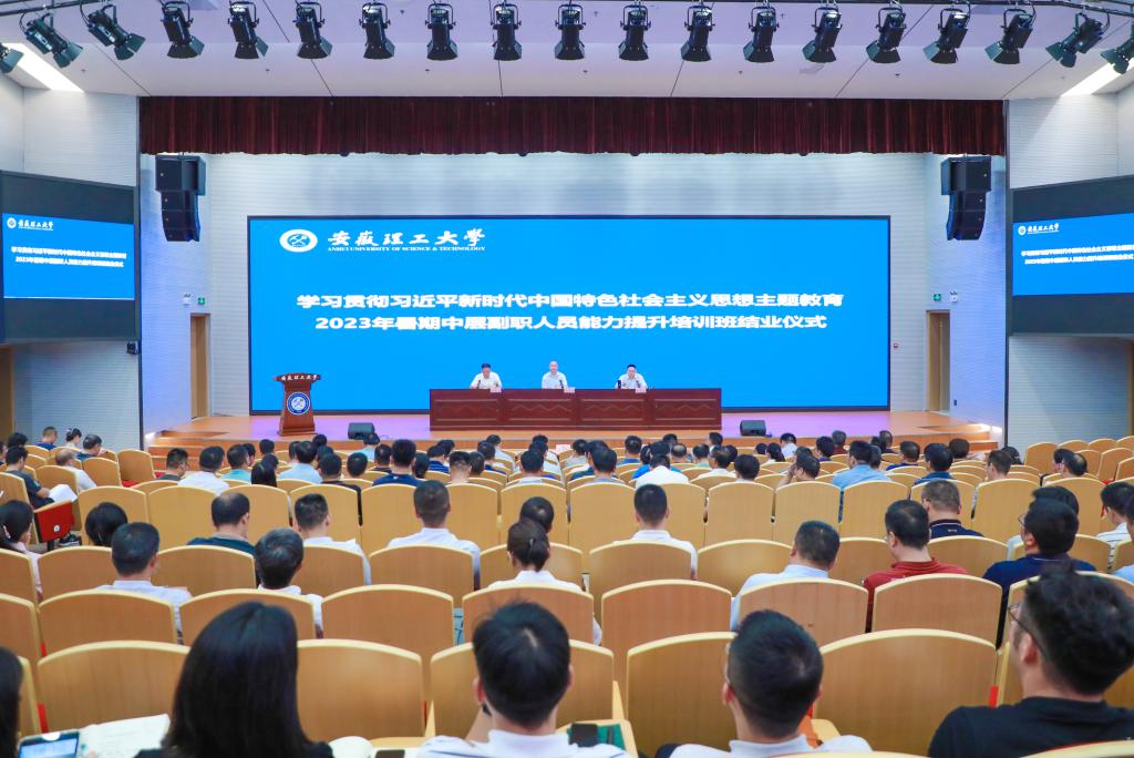 8月23日下午,学校主题教育2023年暑期中层副职人员能力提升培训班结业式在舜耕会堂举行,校党委书记郭永存出席并作题为《深入学习贯彻习近平新时代中国特色社会主义思想,建设堪当创建“双一流”重任的高素质干部人才队伍》的专题辅导报告。校党委副书记、常务副校长余玉刚主持结业式,校党委常委、副校长宫能平、张平松出席。全校中层干部参加会议。